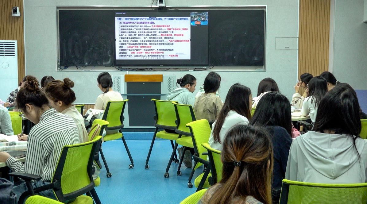 图3:武鸣高中莫钟慧老师在上《产业转型地区的结构优化——以柳州为例》