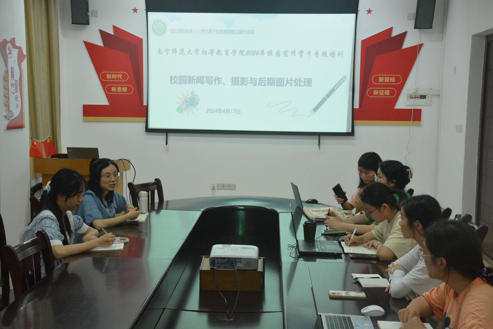 4月17日晚,初等教育学院在五合校区理综楼806会议室召开2024年学生宣传骨干暨校园宣传培训会。初等教育学院团委书记秦晴、辅导员李露露、团委宣传部全体成员参加此次会议。