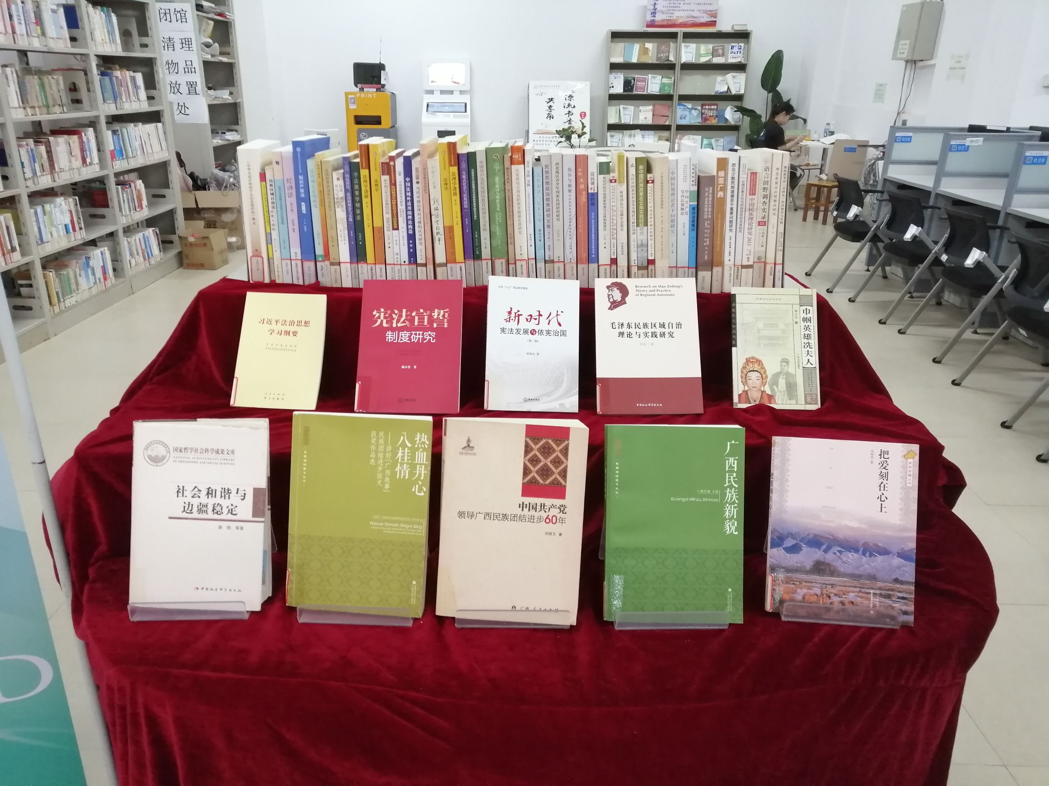 本次图书展出共计300余册,内容涵盖“习近平法治思想”、“习近平总书记关于广西工作论述的重要要求”、“宪法和民法典”、“民族团结相关法律法规和政策规定”等民族理论政策和法律法规,通过书展向师生读者广泛宣传我国民族政策法规,增强我校师生读者法治意识,增进民族认同感,铸牢中华民族共同体意识。