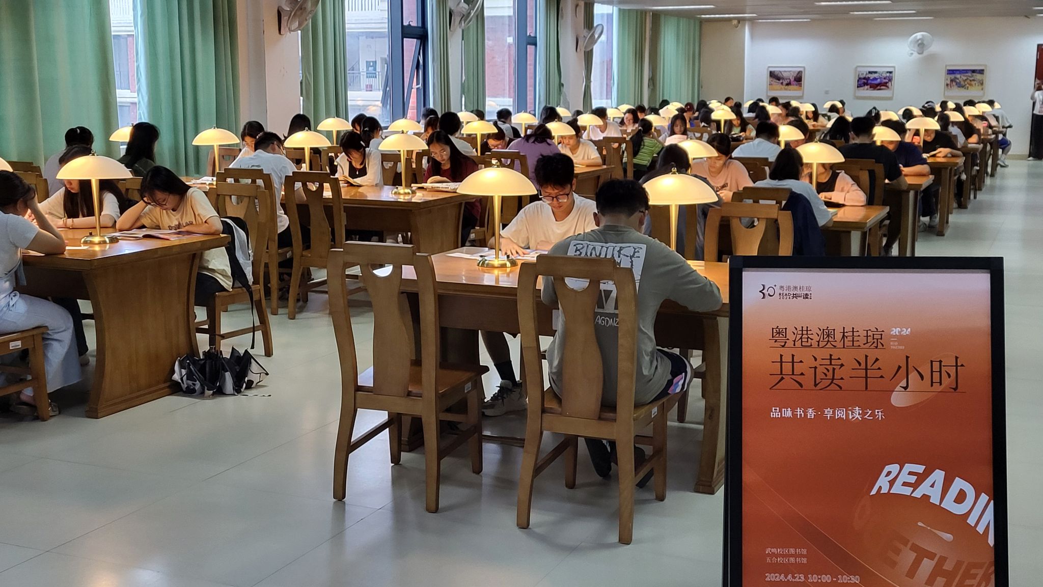 为迎接世界读书日的到来,深入推进全民阅读,传递阅读力量,4月23日上午10点,图书馆积极响应华南图书馆联盟的号召,组织我校师生读者开展粤港澳桂琼五地“共读半小时”活动。我校图书馆作为活动分会场之一,分别在武鸣、五合两校区图书馆设置共读点,来自全校各单位465名师生读者加入共读行列,以集体共读的方式,共享读书之乐,感受阅读之美。