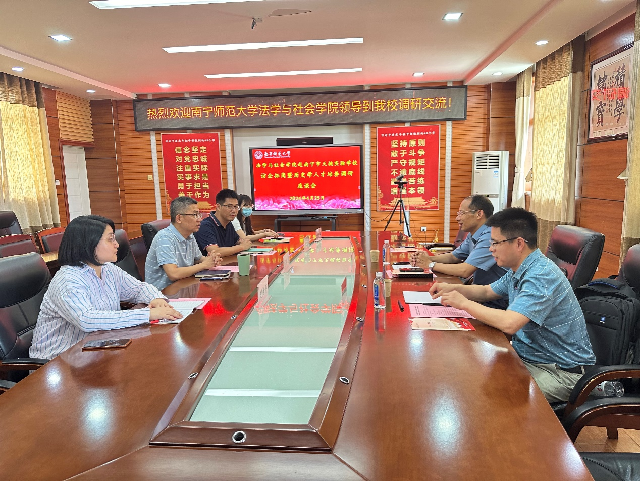 为深入贯彻落实教育部、自治区教育厅和学校关于“访企拓岗促就业”专项行动工作要求,4月25日下午,法学与社会学院尹文嘉院长带队到南宁市天桃实验学校翠竹校区开展访企拓岗与人才培养调研工作。南宁市天桃实验学校教育集团邹南勇校长、翠竹校区李振林副校长、学院历史系主任刘方富、教师代表尚晴博士参加了此次调研和座谈交流。