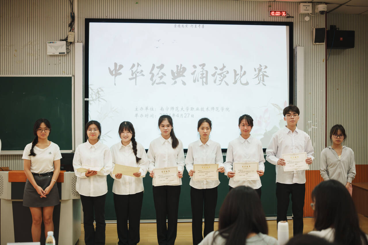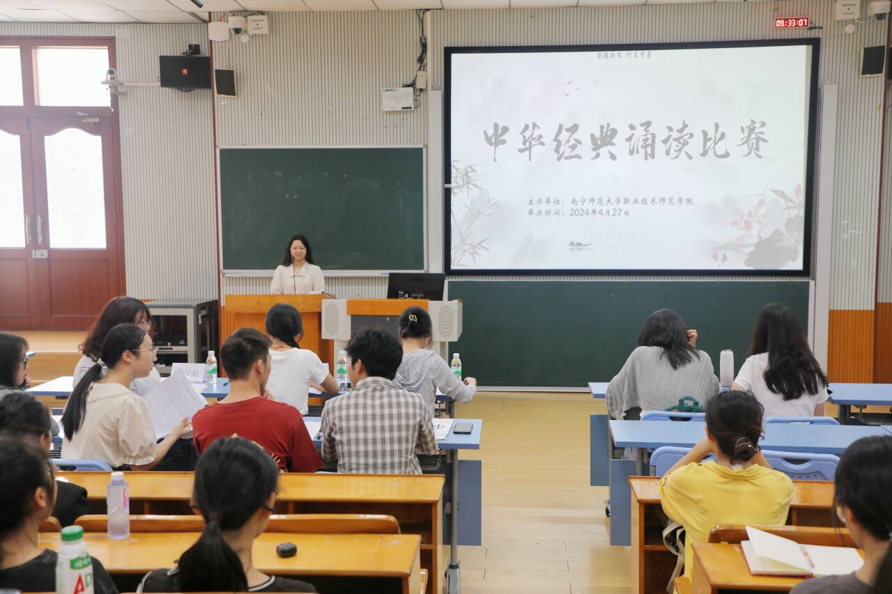 为弘扬中华优秀传统文化,提升同学们对经典文化的认知和兴趣,4月27日上午,职业技术师范学院在文星楼110举行了中华经典诵读比赛。本次比赛邀请了兼职辅导员王丽琼、韦美景,学生会主席喻子航,易班负责人张雪,团委副书记于洋以及新媒体工作站站长卢春维担任评委。