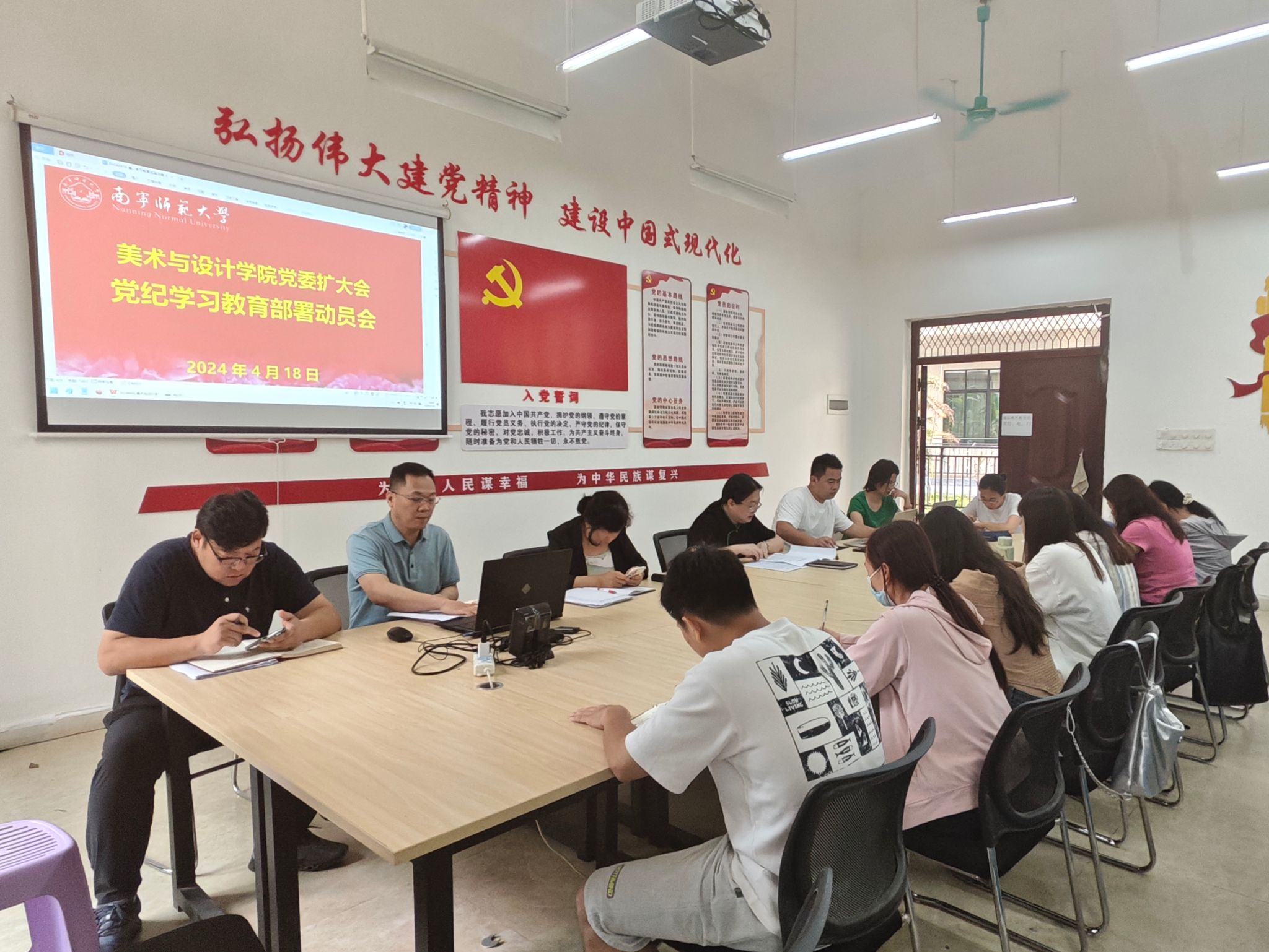 4月18日下午,美术与设计学院党委在123室召开党纪学习教育动员部署会,传达和部署学院党纪学习教育。学院全体党委委员、师生党支部书记参会,会议由党委书记宁英烈主持。
