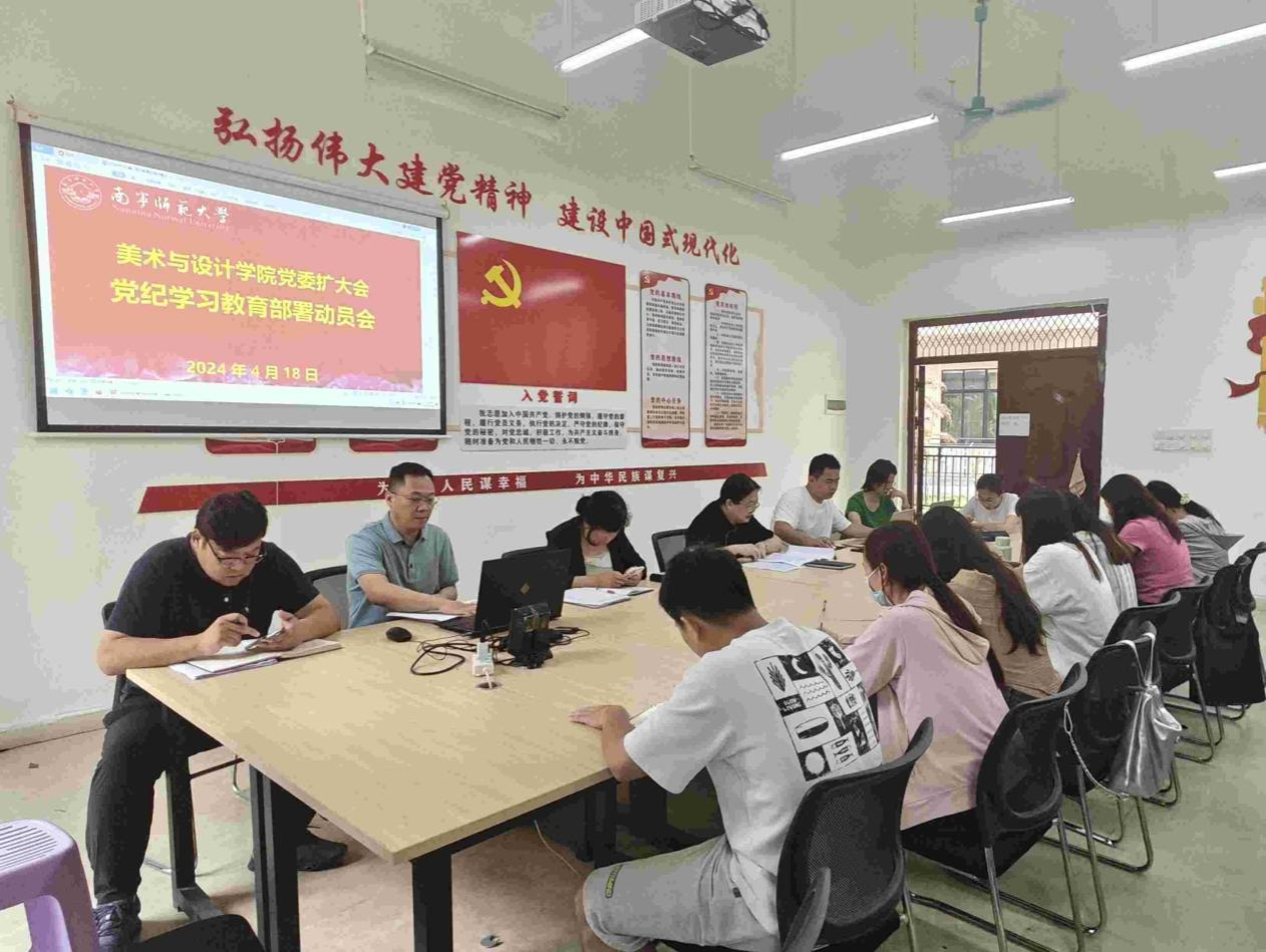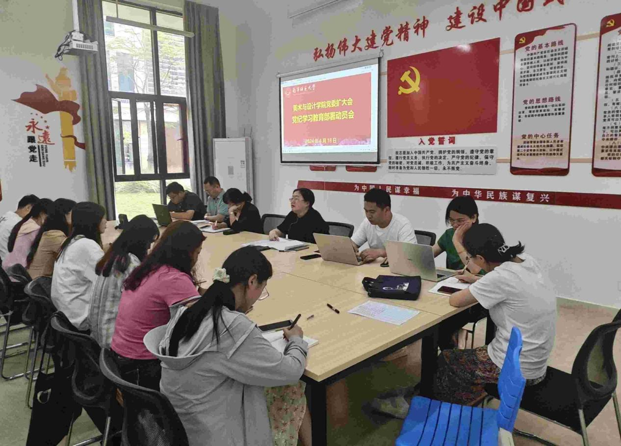 4月18日下午,美术与设计学院党委在123室召开党纪学习教育动员部署会,传达和部署学院党纪学习教育工作,全体党委委员、师生党支部书记参加,会议由党委书记宁英烈同志主持。