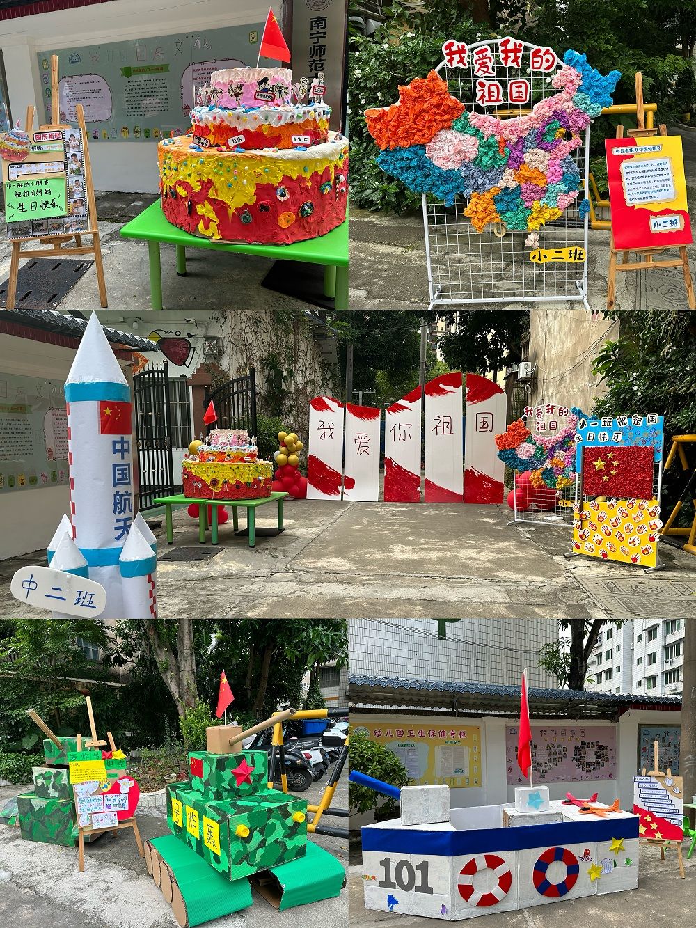 9月29日-30日,开展了“强大的祖国”手工展活动。老师和小朋友们一起制作出了一件件大气磅礴手工作品,有“轰炸号坦克”、“101军舰”、中国航天火箭、国庆蛋糕、辽阔的中国地图、鲜艳的五星红旗等。