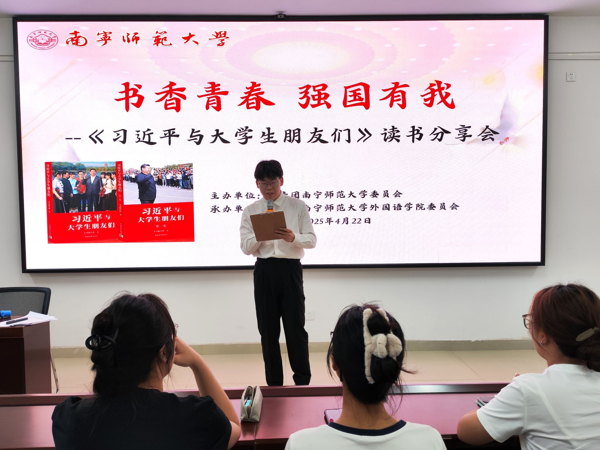 为深入学习贯彻落实习近平总书记关于青年工作的重要思想,引领青年学子积极响应“爱读书、读好书、善读书”的号召,外国语学院于4月22日下午在武鸣校区1号实验楼B座515会议室举办了“书香青春强国有我——《习近平与大学生朋友们》读书分享会”。活动由共青团南宁师范大学委员会主办,共青团南宁师范大学外国语学院委员会承办。