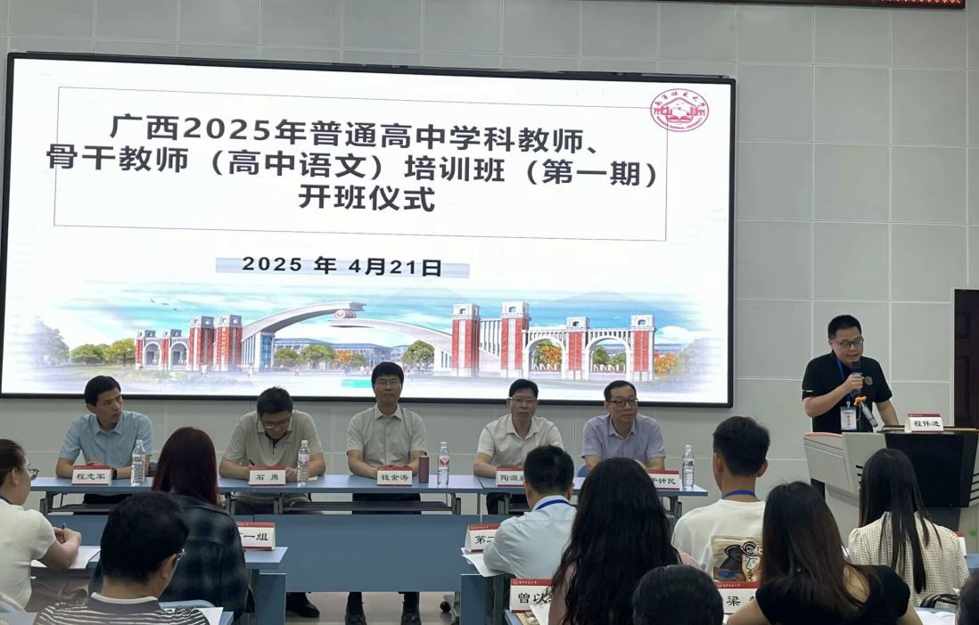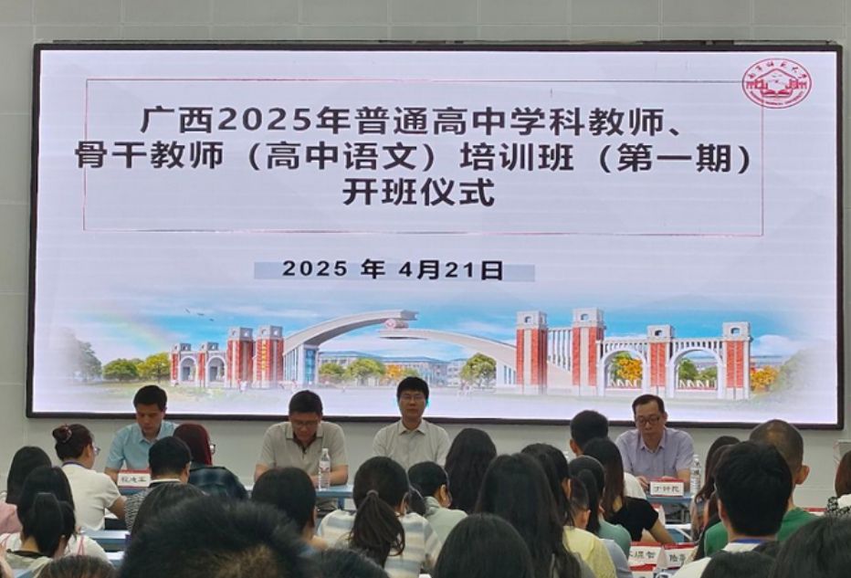 2025年4月21日上午,广西2025年普通高中语文骨干教师培训班(第一期)开班仪式在南宁师范大学明秀校区外语楼报告厅隆重举行。本次培训由自治区教育厅主办、南宁师范大学文学院承办,来自广西14个县市的146名高中语文骨干教师齐聚一堂,开启为期6天的专业研修之旅。南宁师范大学文学院院长石勇、教师教育学院副院长陶源泉、重庆市教研院教研员钱金涛、培训班负责人于钟民、班主任程志军副教授等领导、专家及全体培训学员出席开班仪式,仪式由培训班班主任胡莉萍老师主持。