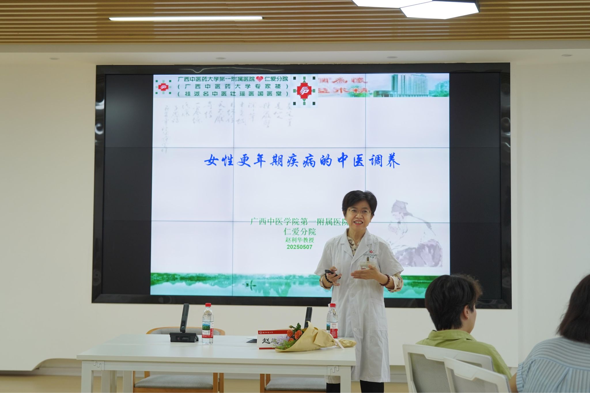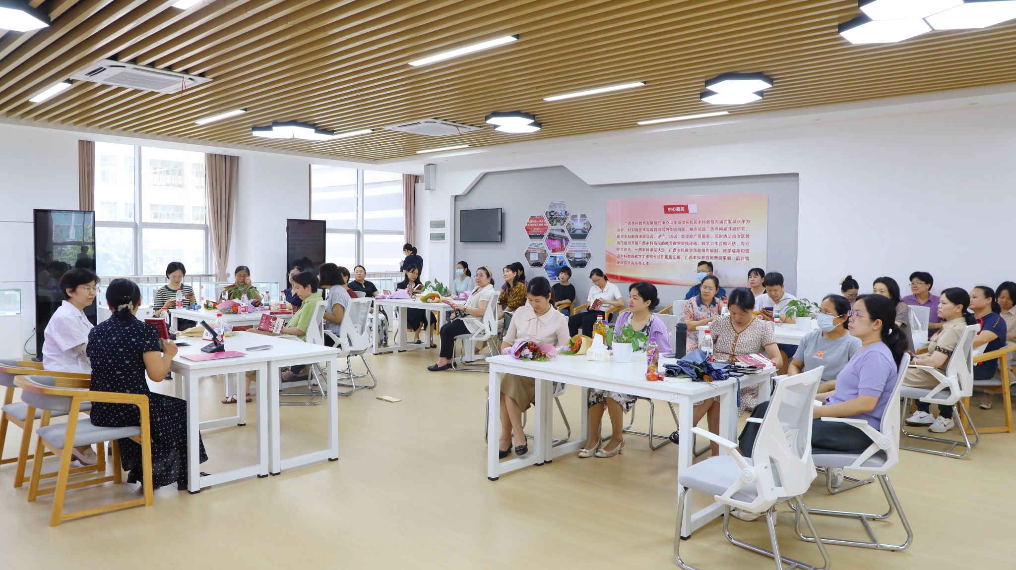 2025年5月7日下午,我校在明秀校区图书馆三楼广西本科教育发展研究中心会议室举办以“掌控芳华‘更’健康”为主题的女教职工阅读分享会。活动由校工会和图书馆联合主办,特邀广西名中医、医学博士、博士生导师赵利华教授为主讲嘉宾,吸引了学校各分工会40多名女教职工积极参与。通过书籍分享、互动交流等形式,展现阅读的魅力,传播科学健康理念。