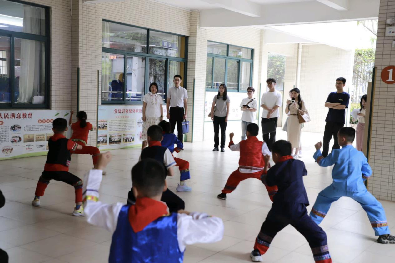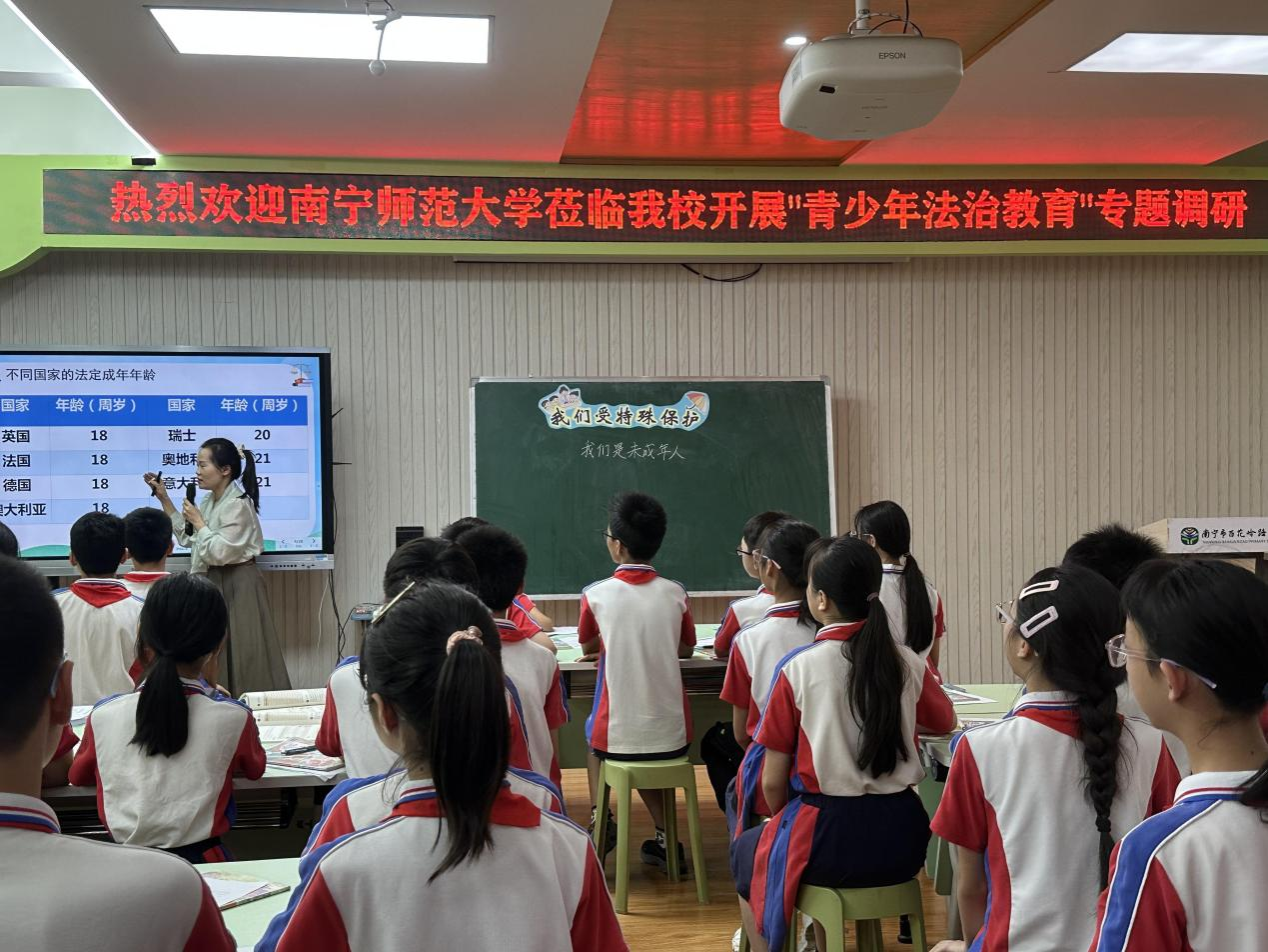 活动当天,百小谢凯书记和李卫权副校长热情迎接了我院师生。调研团队先参观了百小法治文化建设特色展示,欣赏了学生社团表演的壮拳武术,聆听了学生社团琵琶演奏的《上春山》《青花瓷》,观摩了学生们的手工陶泥制作过程,真切感受到学生在课余对民族文化和主流价值的认同。之后,调研团队观摩了韦抑亭老师执教的道德与法治课《我们受特殊保护》,直观了解到该校法治教育成果;参与了韩文婕老师主持的六(4)班主题队会,与同学们积极交流,了解班级日常法治教育活动的开展方式、学生参与情况和收获,直观体会到法治教育在班级里的实际开展情况;听取了李卫权副校长《探索百小法治教育途径》的微讲座,进一步掌握了该校法治教育的具体举措和经验。