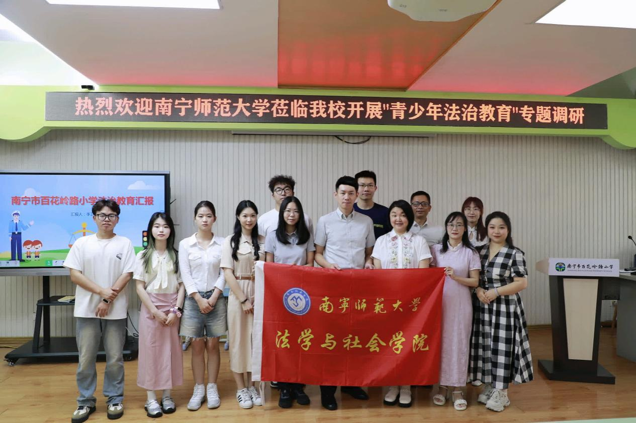 5月8日上午,法学与社会院法律系文立彬副教授和张丽君博士带领法律硕士研究生一行前往南宁市百花岭路小学(下称“百小”),开展“青少年法治教育”专题调研活动。此次调研旨在全面了解该校青少年法治教育的实施情况,探索优化法治教育的新路径。