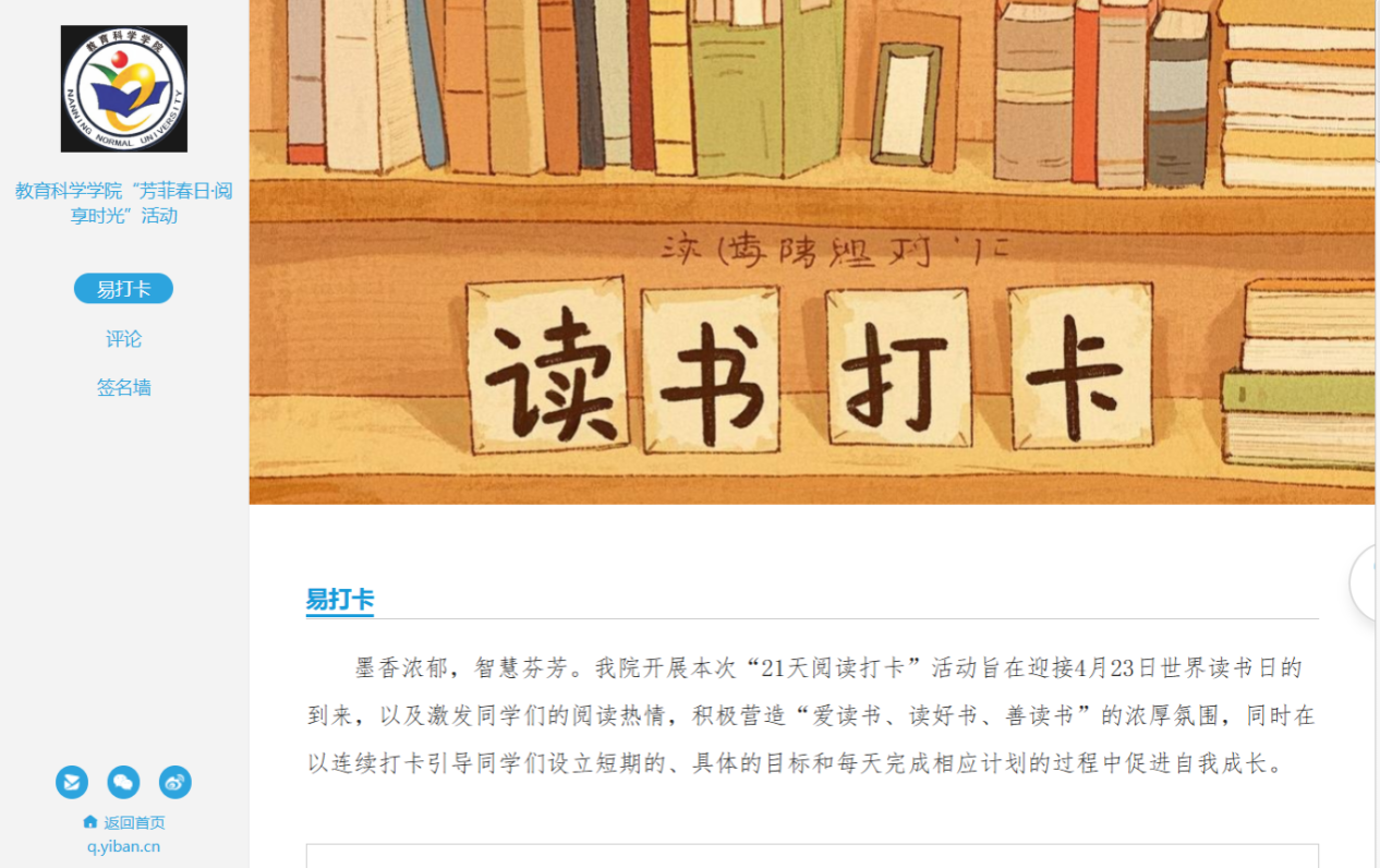为迎接第30个“世界读书日”,营造书香校园文化氛围,教育科学学院于4月-5月举办“芳菲春日·阅享时光”阅读打卡活动。本次活动通过易班手机APP平台开展,旨在激发学生阅读热情,培养良好阅读习惯,引导学生在坚持中实现自我成长。
