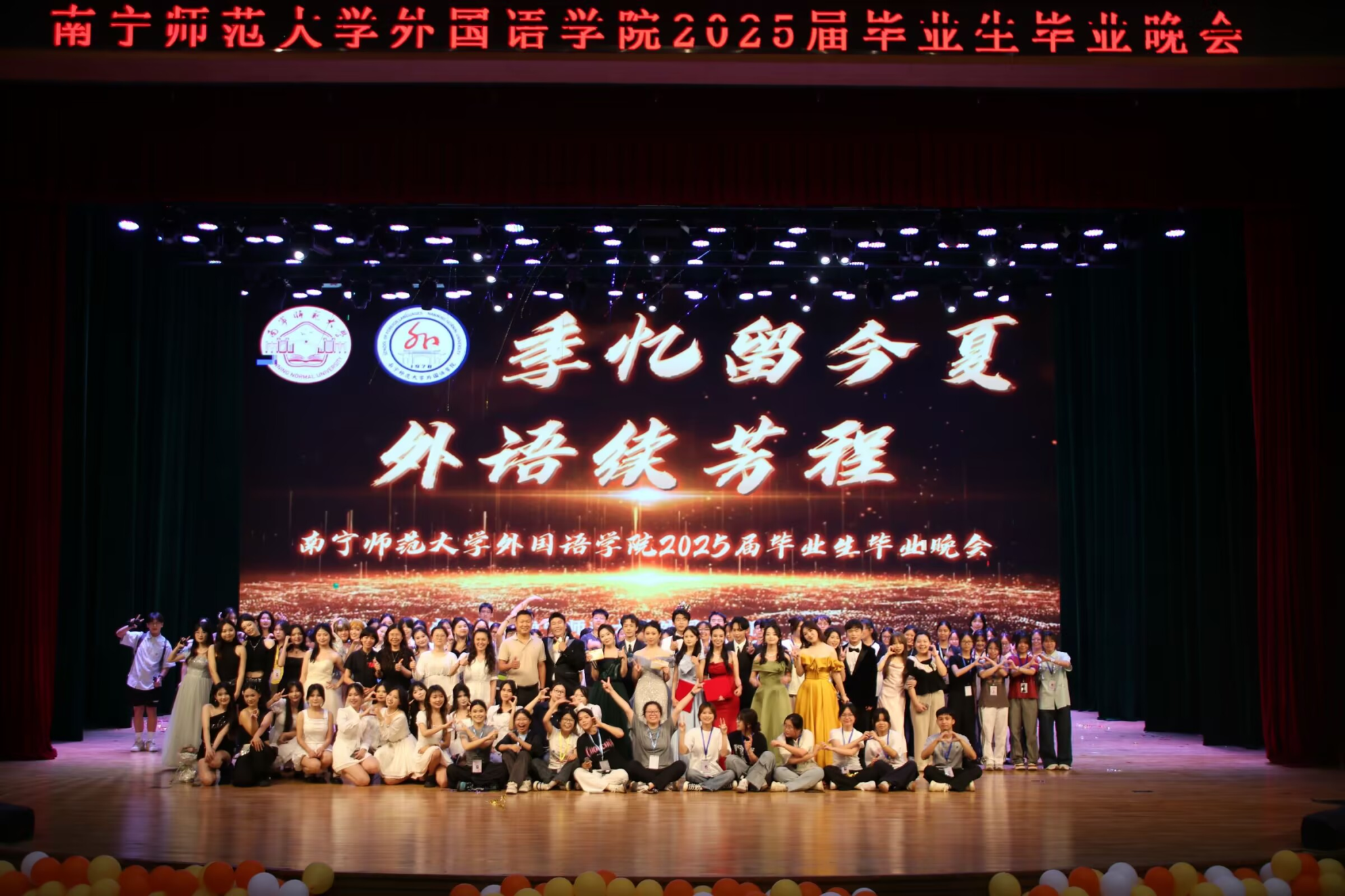 2025年5月20日晚,南宁师范大学外国语学院在武鸣校区音舞院一号报告厅举办2025届“季忆留今夏,外语续芳程”毕业生毕业晚会。外国语学院党委苏华书记、刘晖晖副书记、蒙岚副院长、杨春梅老师、樊毅老师、陈小玲老师、学工办蔡梓晴老师、黄慧梅老师、团副主席团的全体成员们和外国语学院同学们共同观看了此次晚会。