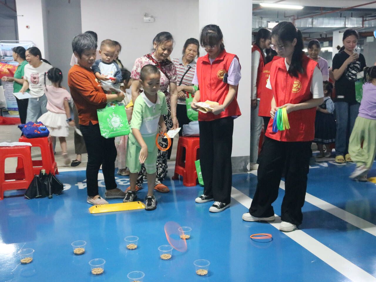 此外,围绕“六一”儿童节主题,初教院青协精心策划了欢乐套圈、知识竞答、跳绳、夹黄豆、小小搬运工、走“钢丝”等六个趣味小游戏。孩子们热情高涨,积极踊跃参与各项游戏,志愿者们全程耐心引导,孩子们凭借集章卡可兑换心仪奖品,现场欢声笑语不断,气氛热烈欢快。