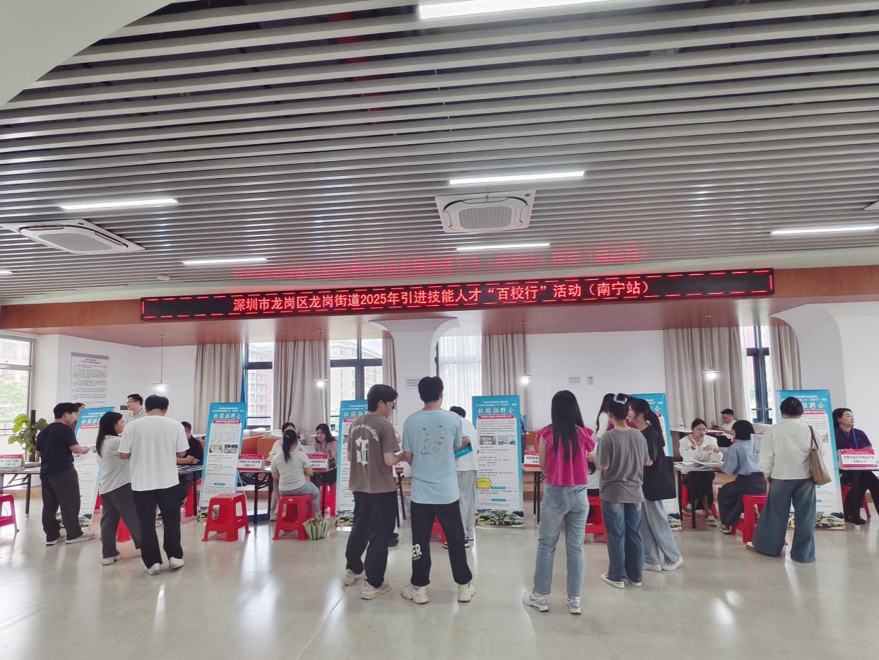 5月21日,深圳市龙岗区龙岗街道2025年引进技能人才“百校行”活动(南宁站)在我校武鸣校区大学生生涯教育与就业指导中心成功举办。本次活动共组织龙岗街道10家优质用人单位来校招聘,提供就业岗位231个,吸引了来自我校不同专业的350余名毕业生踊跃参与。