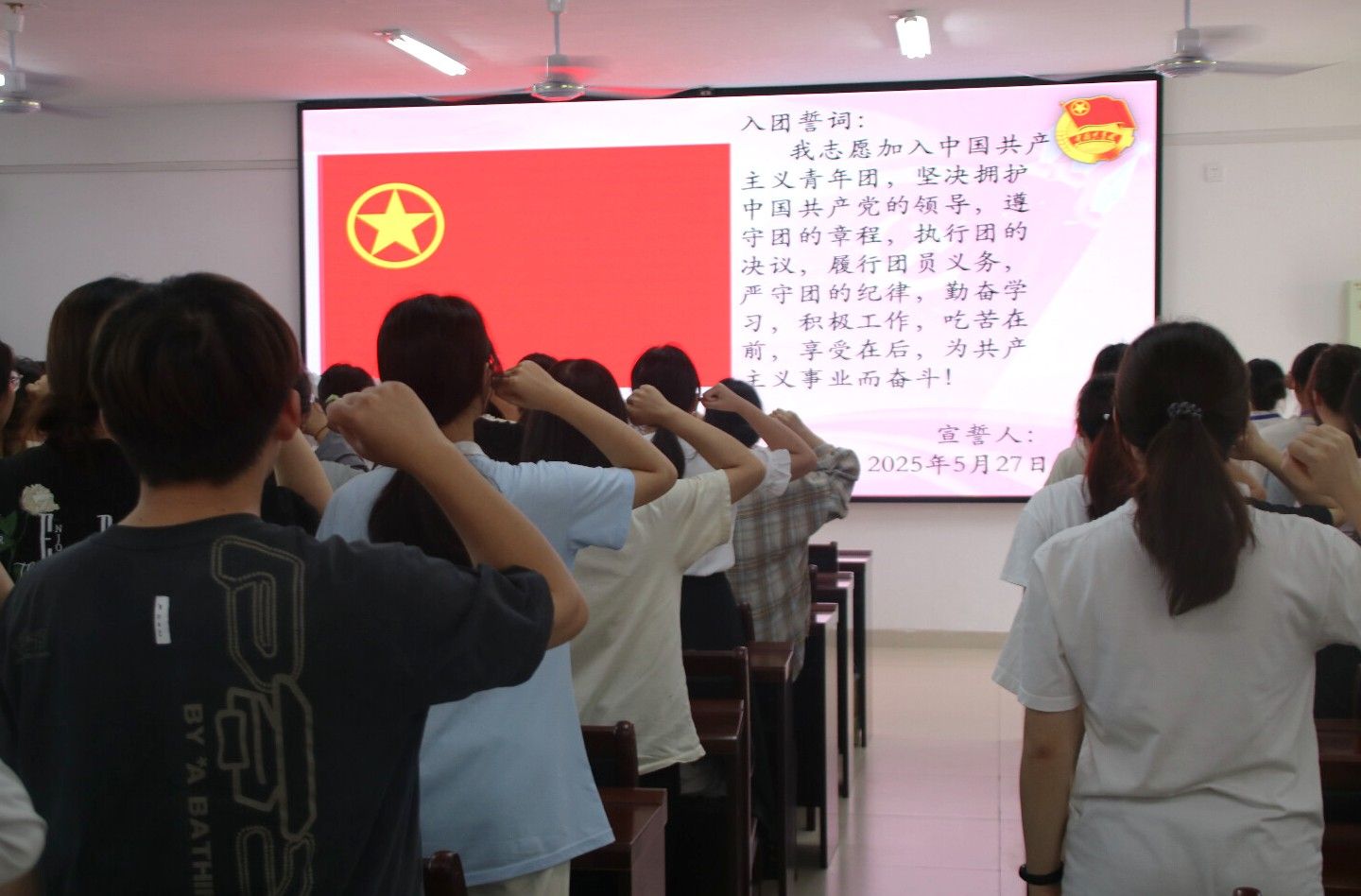 仪式在庄严的国歌中拉开序幕。首先,主持人宣读了新发展团员名单,热烈欢迎新团员的加入。紧接着,蔡梓晴老师和优秀团员、党员代表为新团员颁发并佩戴团徽。全体新团员在主持人的带领下进行入团宣誓,铿锵的誓言彰显青春信念。