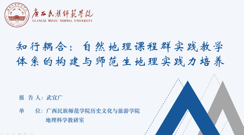 广西民族师范学院武宜广博士以“聚知行耦合:自然地理课程群实践教学体系的构建与师范生地理实践力培养”为主题,介绍了广西民族师范学院自然地理学课程群开设情况,基于师范生地理实践力核心素养的培养介绍了该校野外实习、实训室建设、3S融合提升地理实践力系列实验等经验,展示了广西民族师范学院在自然地理实践教学方面的成果。