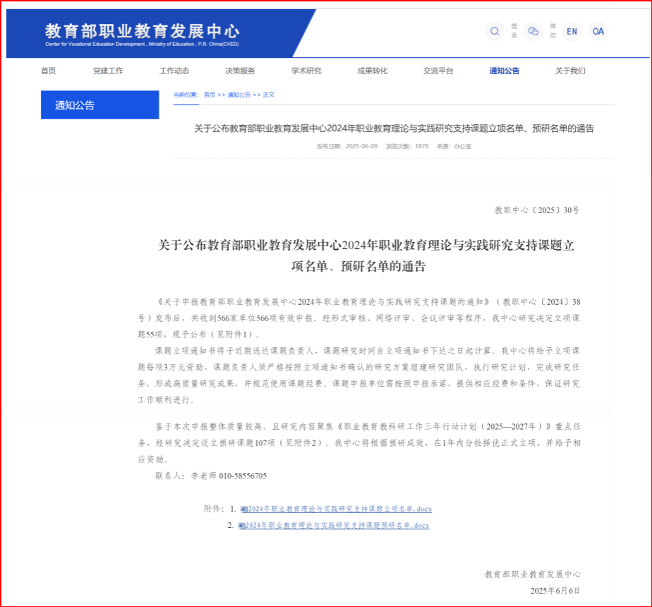 近日,教育部职业教育发展中心公布2024年职业教育理论与实践研究支持课题立项名单,我校职业技术师范学院院长陈良教授主持申报的《省域职教高考制度构建与运行机制研究》课题成功获批立项。该课题聚焦在现代职业教育体系构建中的热点问题,省域职教高考制度如何突破传统框架,构建起具有前瞻性、创新性的制度框架,以及形成与之适配的良性运行机制,旨在为新时代职业教育改革提供理论支撑与实践路径,标志着我校在职业教育研究领域取得新突破。