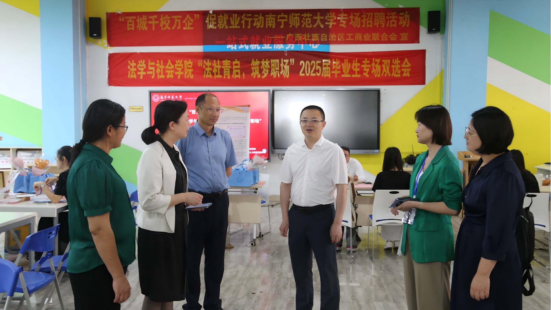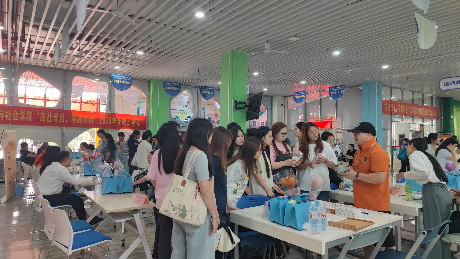 为有效推进毕业生就业工作,为毕业生和用人单位架起便捷交流平台,2025年5月27日,法学与社会学院在五合校区就业指导服务中心成功举办了南宁师范大学“法社青启,筑梦职场”2025届毕业生双选会。本次双选会由南宁师范大学主办,法学与社会学院承办,广西民营服务业商会和广西锦绣前程人力资源有限公司协办,并得到学校招生就业处及广西壮族自治区工商业联合会的具体指导;共有23家企业参会,岗位需求196个,与我院专业高度契合,共吸引了300余名学生参与。