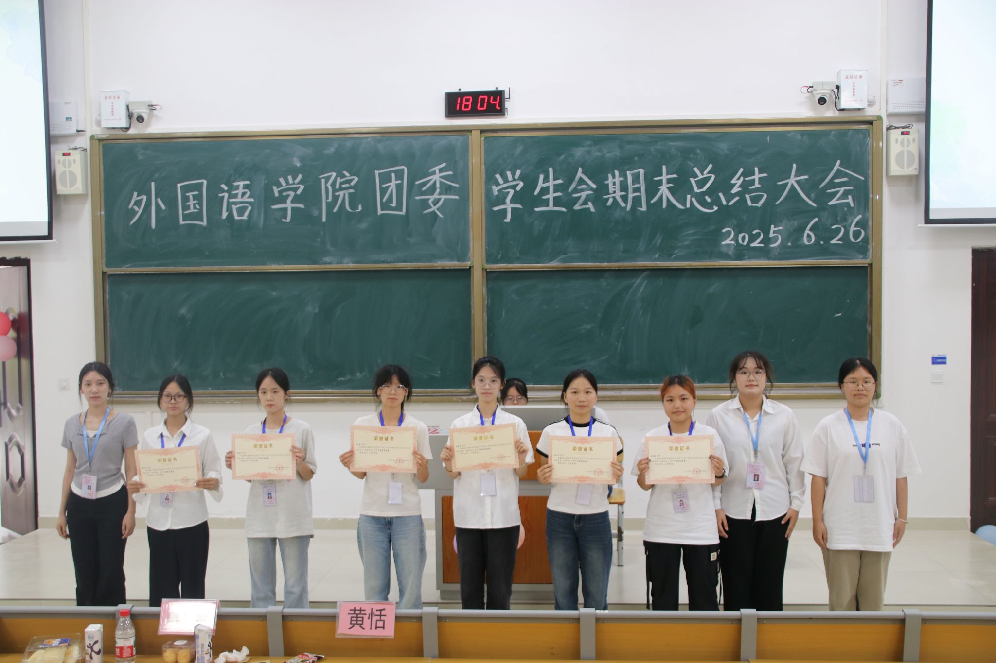 最后,各部门工作人员为本学期优秀志愿者及后备团成员颁奖。随着颁奖环节的顺利结束,外国语学院团委学生会2024-2025学年第二学期期末总结大会正式落下帷幕。