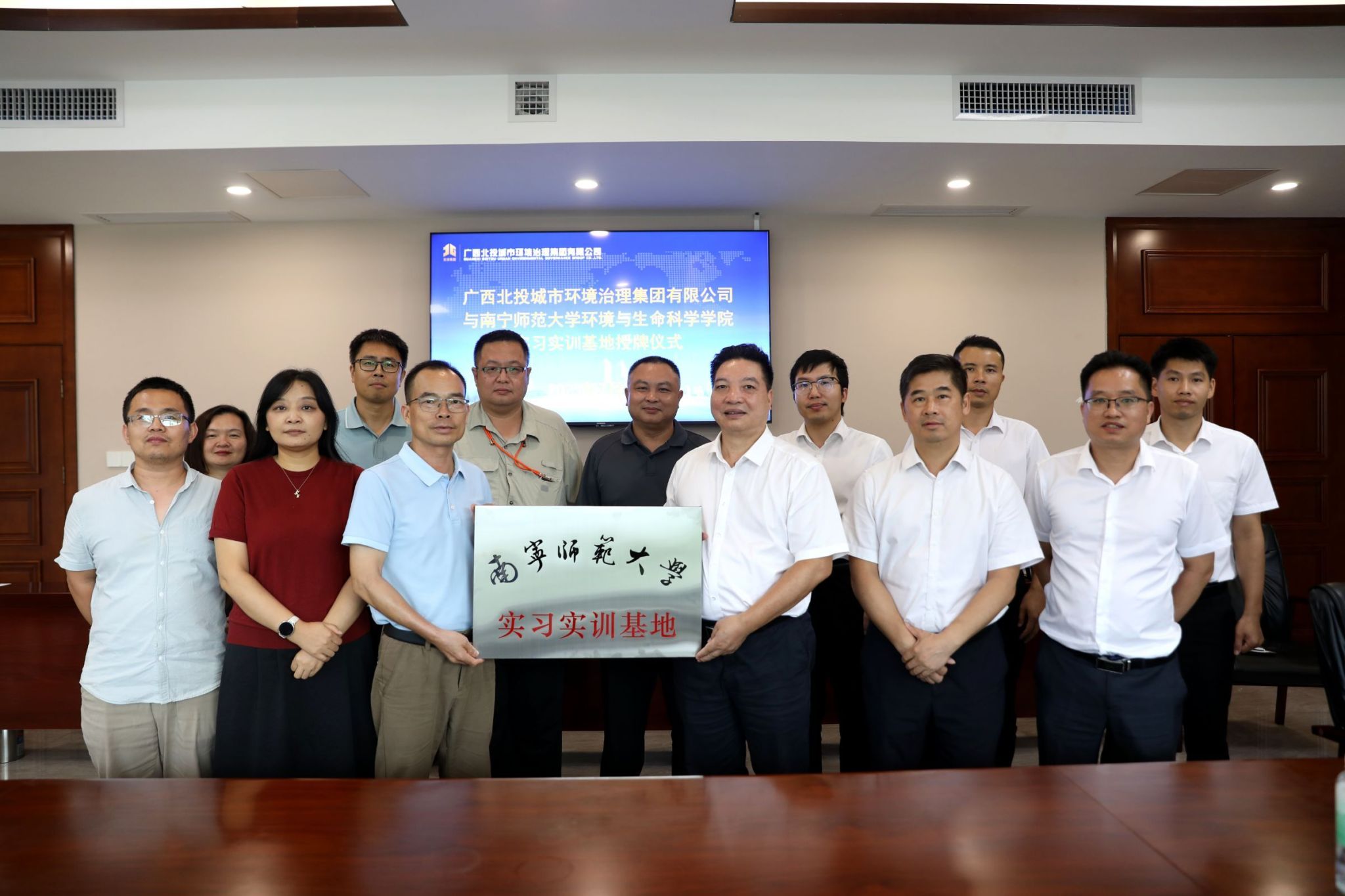 广西北投城市环境治理集团有限公司党委副书记、董事、总经理李荣建热情接待了学院一行,通过播放企业宣传片简要介绍了公司的基本情况、发展定位、核心业务、发展优势及企业文化。环境与生命科学学院党委副书记(主持党委工作)韦东林向企业介绍了学院的专业设置、办学特色、人才培养、科学研究和招生就业等情况,并对企业在人才培养、实习、就业工作等方面对学院提供的大力支持表示衷心的感谢。随后,校企双方围绕就业创业、人才培养、校企合作、产教融合等方面开展了深入交流。最后,校企双方进行了南宁师范大学实习实训基地授牌仪式。