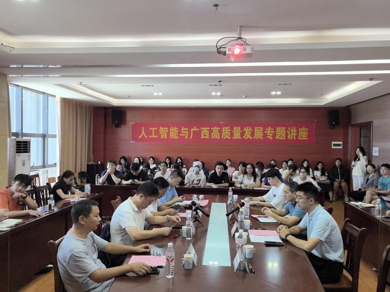 为深入学习贯彻习近平总书记关于人工智能的重要论述,贯彻落实自治区党委关于发展人工智能赋能千行百业的决策部署,聚焦人工智能与广西经济社会各领域融合发展的关键问题,探索高质量发展新路径、新动能。9月5日,由广西壮族自治区社会科学界联合会主办,广西区域科学学会与南宁师范大学经济与管理学院承办,广西区域与城市经济研究会协办的“人工智能与广西高质量发展”专题讲座在学校五合校区顺利举行。本次讲座由经济与管理学院党委书记韦海鸣教授主持,来自校内外专家、学者约60人参会。