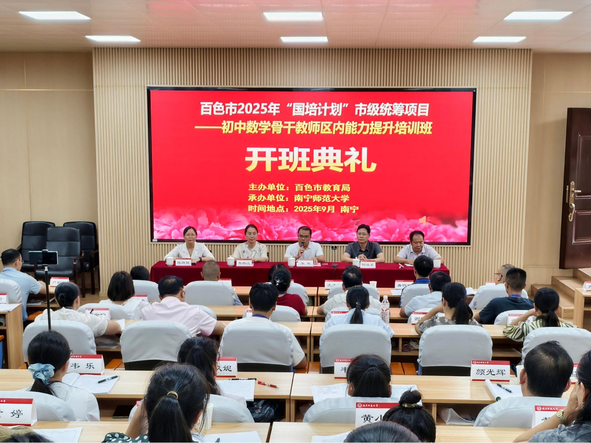 由百色市教育局主办、我校数学与统计学院承办的百色市2025年“国培计划”市级统筹项目——初中数学骨干教师区内能力提升培训班开班典礼在学校明秀校区举行。百色市教育局副局长梁华,我校教师教育学院副院长陶源泉、数学与统计学院副院长韦扬江出席典礼,来自百色市各县(区)的80名初中数学骨干教师参加本次培训。