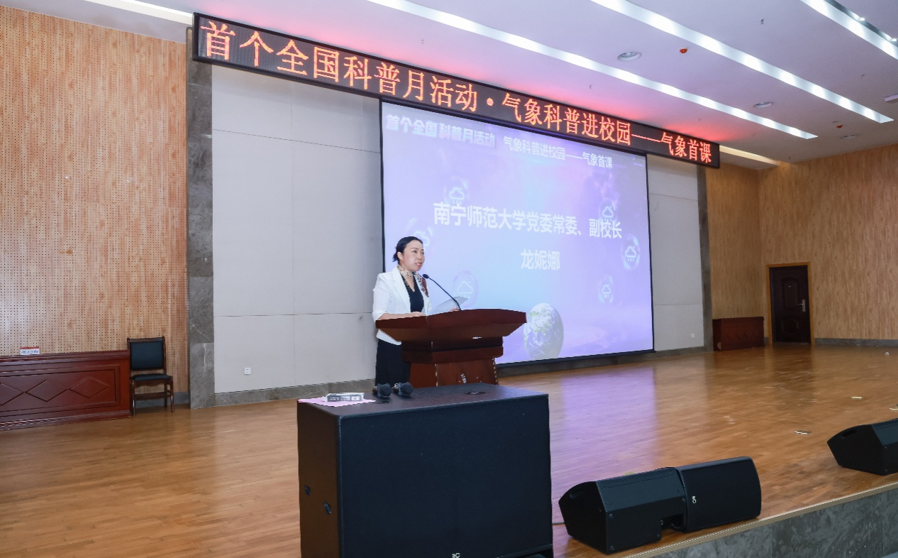 我校龙妮娜副校长出席活动并致辞。龙妮娜强调,“气象首课”活动不仅是科普课,更是一堂融合思政与专业启航的“金课”,引导新生关注气象科学与国家粮食安全、生态文明及防灾减灾等重要领域的联系,助力培养复合型气象人才。学校与广西壮族自治区气象局已签署合作协议,学校首批大气科学专业本科生已入学,希望双方共同推进人才培养,为广西高质量发展提供气象科技支撑。同时希望同学们在大学旅程中乘风破浪,收获知识、启迪思维,共同筑就气象事业新未来。