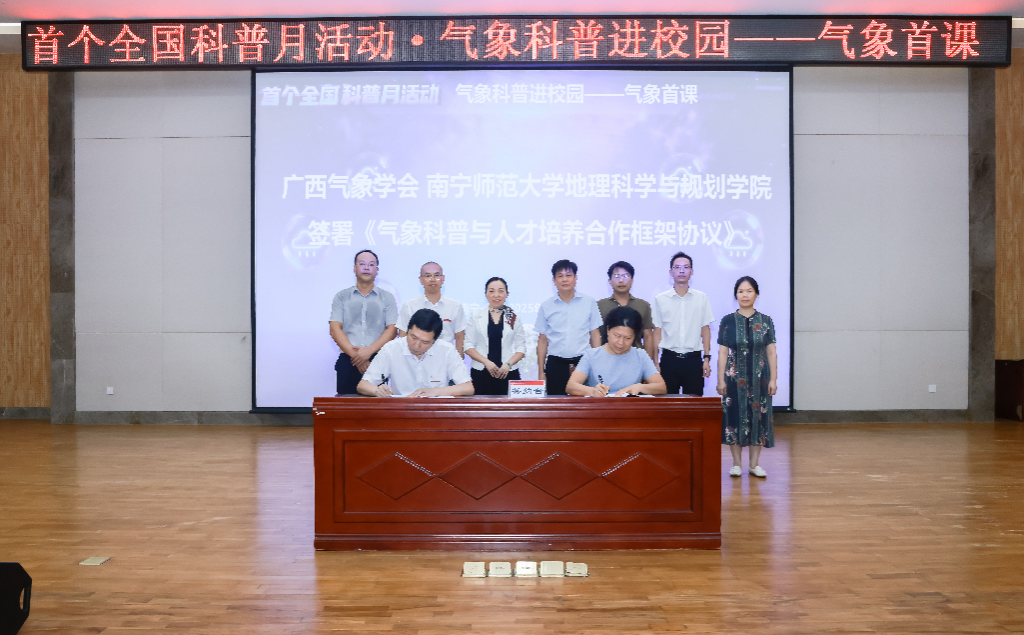 期间,南宁师范大学与广西气象学会共同签署了《气象科普与人才培养合作框架协议》,学生代表宣读了《气象科普志愿者倡议书》。“气象首课”活动的顺利举办,引发了在座同学的强烈共鸣,为我校大气科学专业2025级新生明确了学业发展方向。同学们纷纷表示,将在未来的学习生活中,夯实专业基础,为建设气象强国、实现中华民族伟大复兴贡献青春力量。