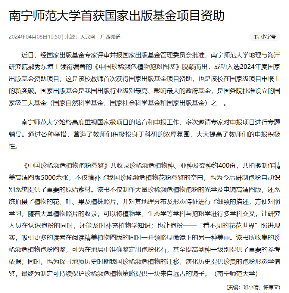 【人民网】南宁师范大学首获国家出版基金项目资助
