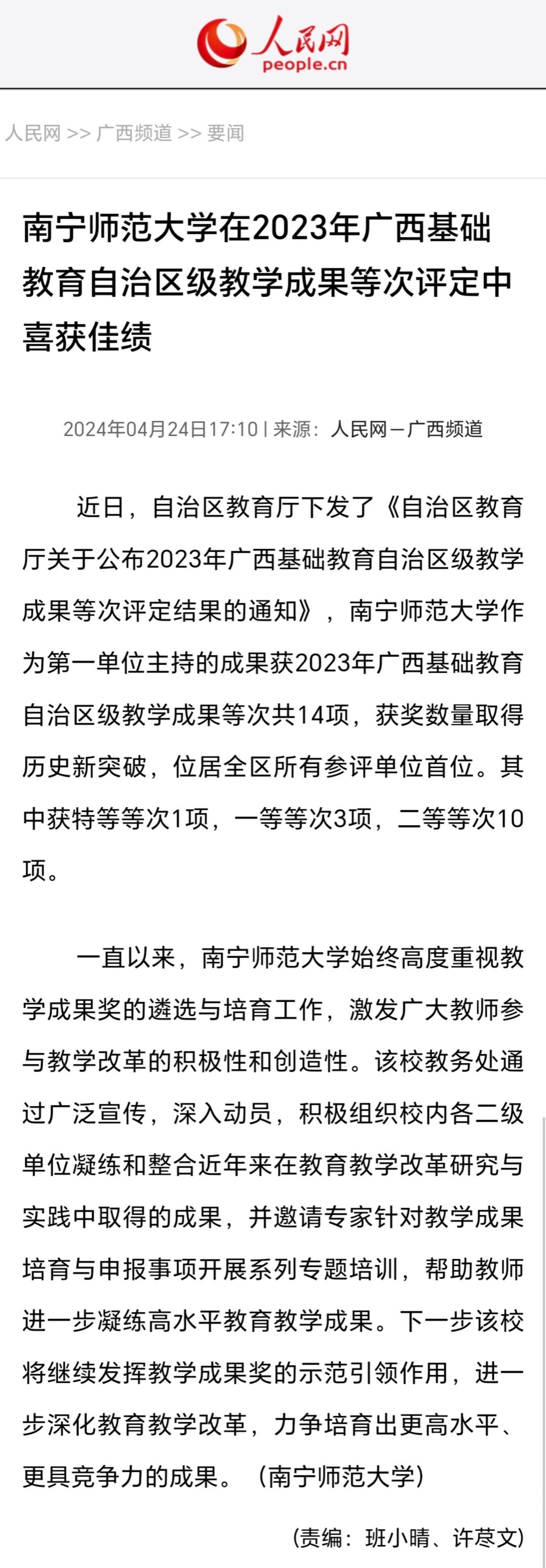 【人民网】南宁师范大学在2023年广西基础教育自治区级教学成果等次评定中喜获佳绩