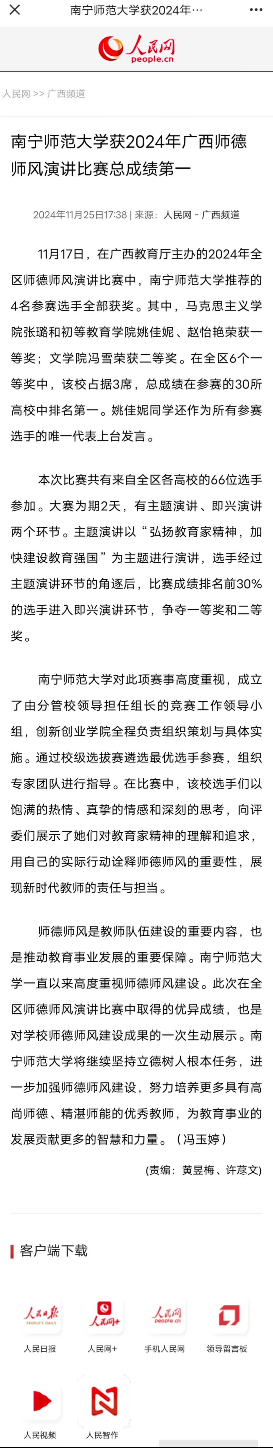 【人民网】南宁师范大学获2024年广西师德师风演讲比赛总成绩第一
