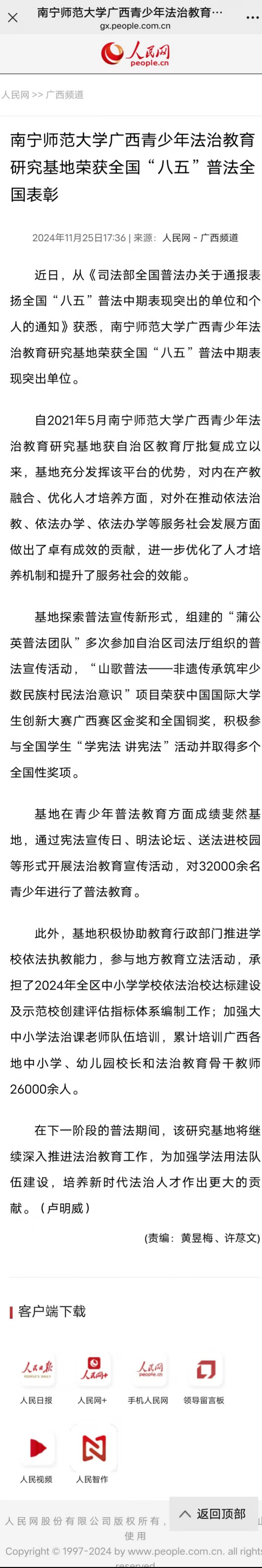 【人民网】南宁师范大学广西青少年法治教育研究基地荣获全国“八五”普法全国表彰