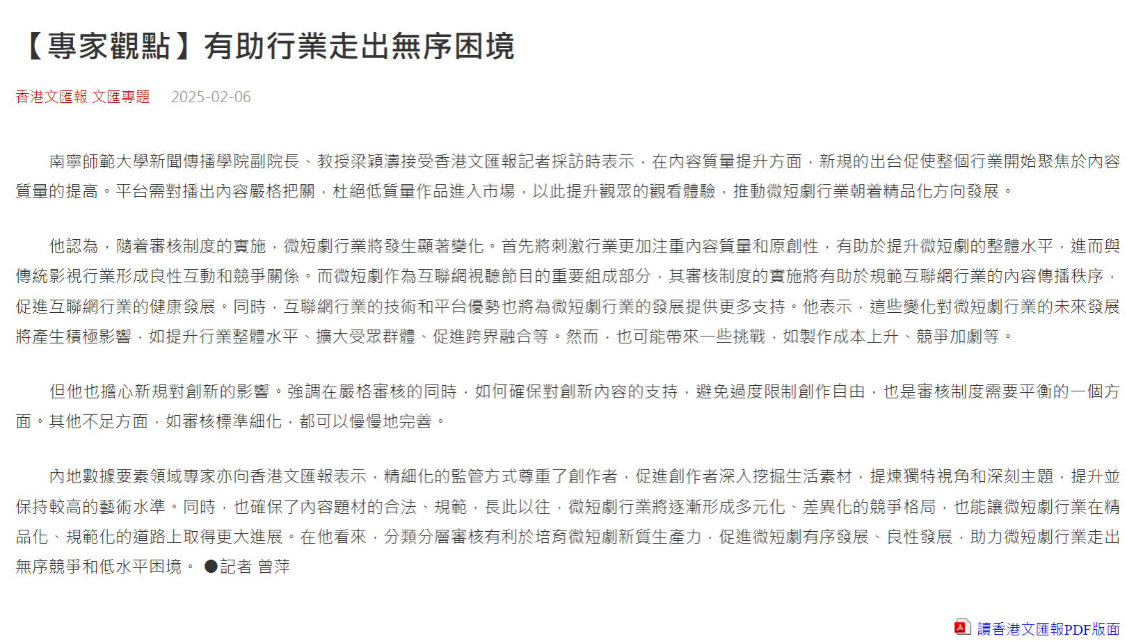 香港文汇报于2025年2月4日至6日连续三天刊发了《微短剧透视系列》报道,深入探讨了微短剧发展过程中所遇到的问题与乱象。新闻与传播学院教授梁颖涛在接受采访时表示,新规的出台将有助于提升微短剧的内容质量,推动行业朝着精品化方向发展。