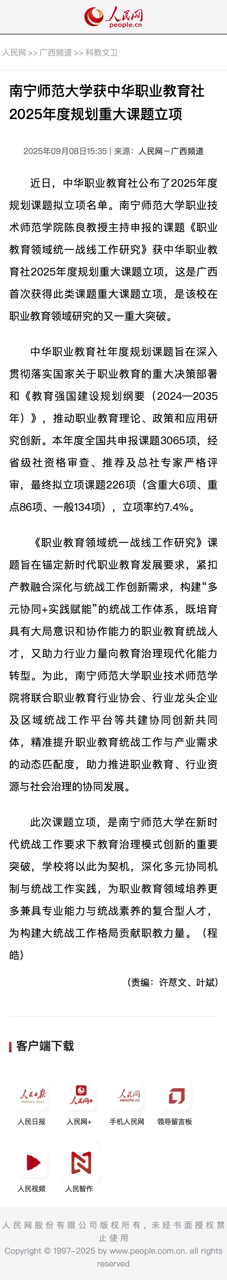 【人民网】南宁师范大学获中华职业教育社2025年度规划重大课题立项
