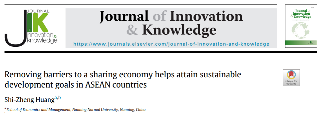 近期,我校经济与管理学院黄世政教授以南宁师范大学为第一单位在SSCI国际顶级期刊《Journal of Innovation & Knowledge》上发表题为“Removing barriers to a sharing economy helps attain sustainable development goals in ASEAN countries”的高水平学术论文。《Journal of Innovation & Knowledge》是管理学领域的JCR一区SSCI期刊,2022年影响因子IF:18.10、中科院一区Top期刊。此外,黄世政教授指导博士生以南宁师范大学为第一单位在SSCI国际权威期刊《Corporate Social Responsibility and Environmental Management》发表题为“Promoting sustainable development: Multiple mediation effects of green value co-creation and green dynamic capability between green market pressure and firm performance”的高水平学术论文。该期刊是环境研究和管理学领域收录刊物的前10%期刊,2022年影响因子IF:9.80、JCR一区SSCI、中科院二区。