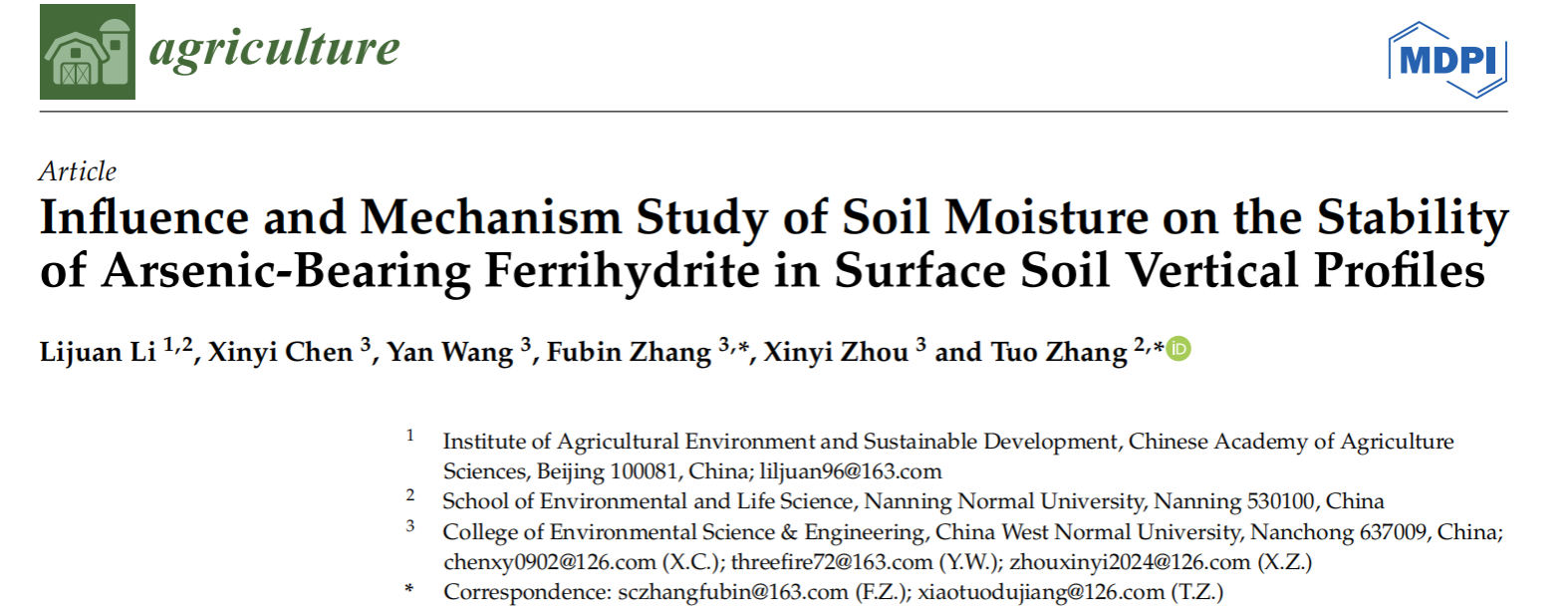 近日,我校环境与生命科学学院张拓副教授分别与北京大学、新疆农业大学、中国农业科学院和湖南省农业科学院合作在工程技术/化工领域著名期刊《Separation and Purification Technology》(中科院1区TOP,JCR1区,IF2023=8.1),综合类领域期刊《Scientific Report》(中科院2区,JCR1区,IF2023=3.8)、农业综合领域期刊《AgricultureBasel》(中科院2区,JCR 1区,IF2023=3.3)等著名期刊发表了4篇高水平研究论文。上述文章深度探究了新型环境功能材料UiO-66-SH、海泡石负载纳米零价铁S-nZVI和纳米水铁矿在水体和土壤环境中对砷和镉两种重金属的同步钝化过程机制和重金属污染在土壤长期耕作条件下潜在的迁移释放过程机制。张拓副教授为上述4篇论文的通讯作者,南宁师范大学作为参与单位完成相关研究。上述多项研究工作得到了国家自然科学基金、国家重点研发计划课题、四川省自然科学基金和中央级科研院所基本科研业务费的支持。