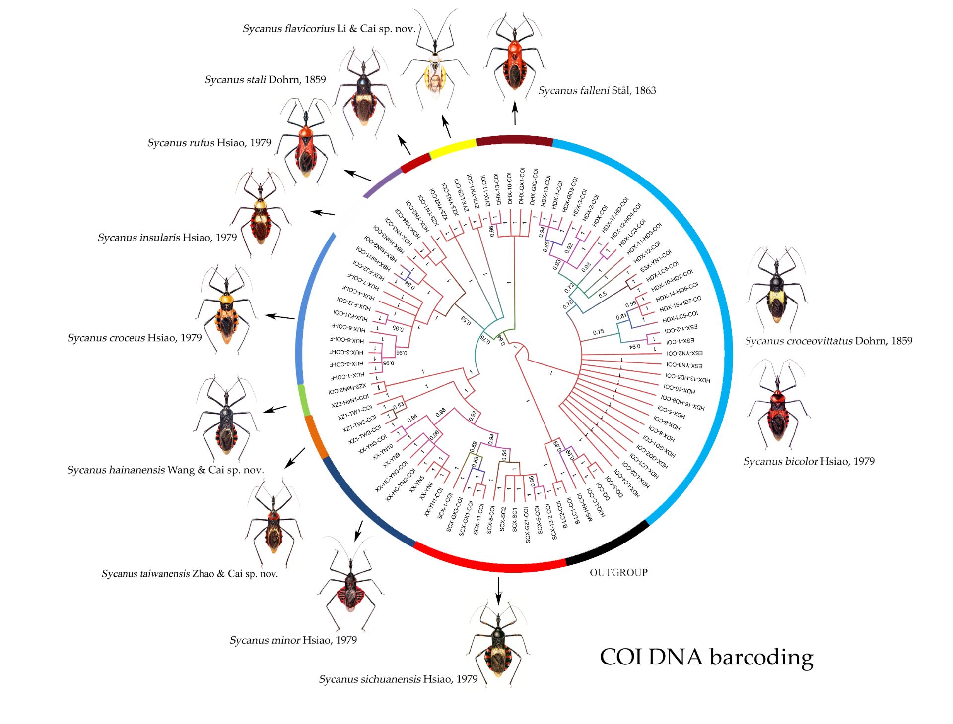 为全面厘定中国犀猎蝽物种,我校地理与海洋研究院生物多样性团队结合DNA条形码分子和形态数据,对中国分布的犀猎蝽81个个体进行物种界定和系统发育分析,将其划分为12分子种(图1),12种犀猎蝽被确定为实种(图2),其中包括3个新种,即:台湾犀猎蝽Sycanus taiwanensis Zhao & Cai, 2024, 黄革犀猎蝽S. flavicorius Li & Cai, 2024和海南犀猎蝽S. hainanensis Wang & Cai, 2024;尤其是通过与英国大英博物馆、德国柏林自然历史博物馆和丹麦哥本哈根自然历史博物馆,及国内南开大学、中科院动物研究所积极联络,查看犀猎蝽模式标本,还提出了犀猎蝽属的5个同物异名,即:S. croceovittatus Dohrn, 1859, S. leucomesus Walker, 1873, 和S. villicus Stål, 1863是黄带犀猎蝽S. bifidus (Fabricius, 1787)的3个同物异名,S. bicolor Hsiao, 1979 是二色犀猎蝽S. versicolor Dohrn, 1859的同物异名,S. hsiaoi MaldonadoCapriles, 1990是S. marginellus Putshkov, 1987的同物异名;此外,还记述了大红犀猎蝽S. falleni Stål, 1863(图3)和黄犀猎蝽S. croceus Hsiao, 1979的生活史和若虫形态特征。该工作从形态分类学、分子分类学、分子系统发育及生物学多角度对中国犀猎蝽进行全面综合分类研究,具有重要学术价值。
