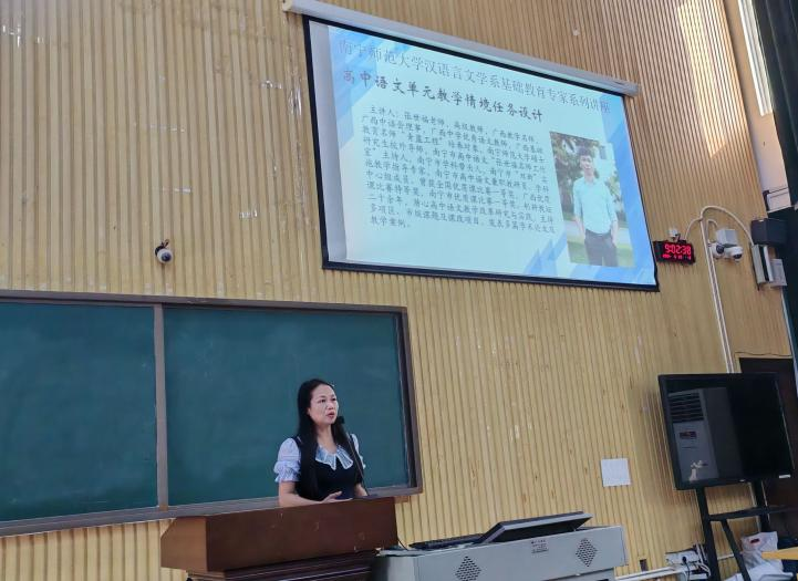 为扎实做好师范生教育培养工作,提升学生语文教学设计的能力和水平,9月28日,南宁师范大学文学院邀请了广西教学名师、广西中学优秀语文教师张世福,为师范生带来题为《高中语文单元教学情境任务设计》的专题讲座,对师范生教师技能比赛进行实战指导。讲座由文学院老师王毅主持,韦美日教授、2024级研究生和2022级本科生参加了此次讲座。
