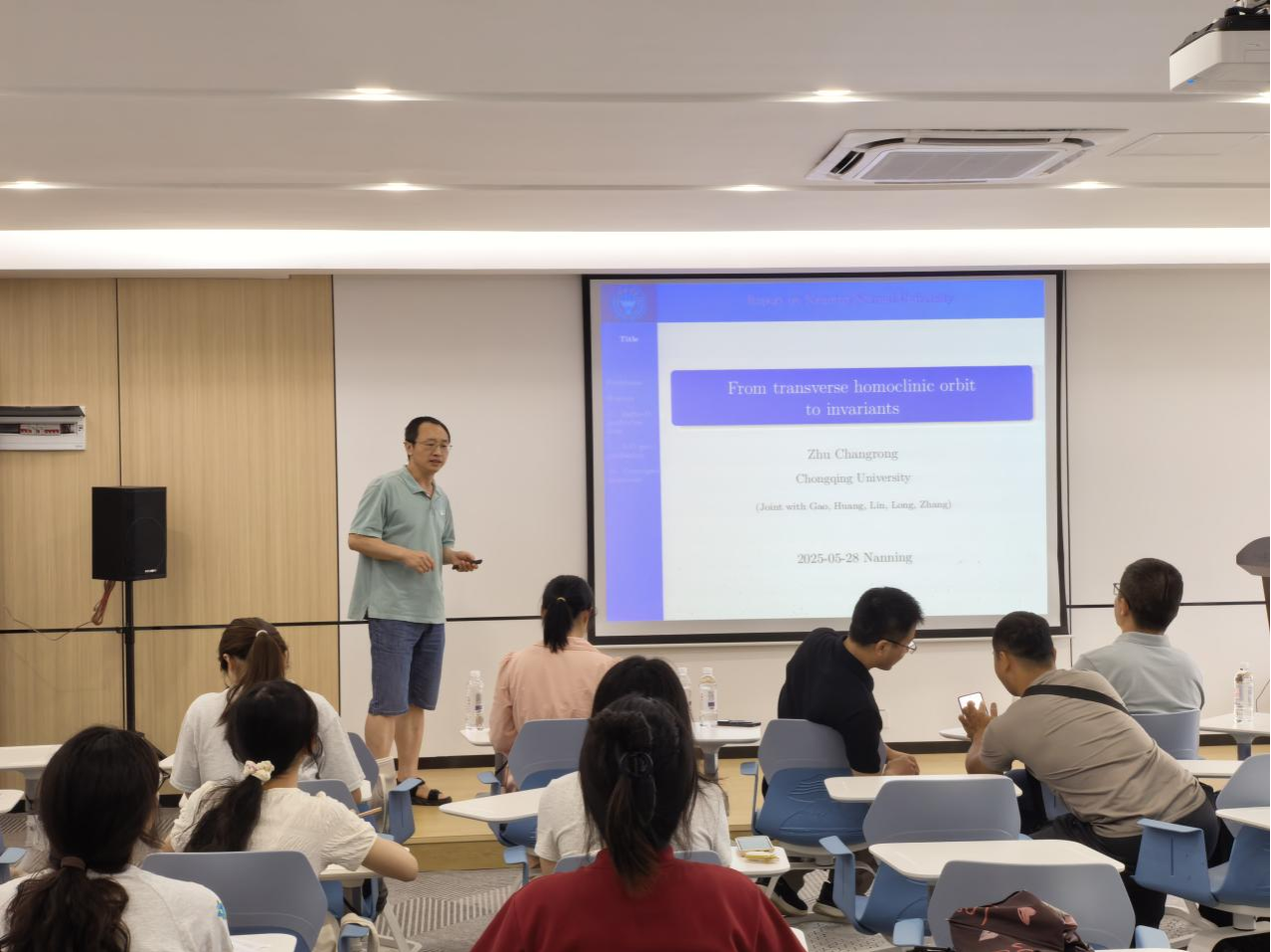 2025年5月28日,应广西应用数学中心(南宁师范大学)的邀请,重庆大学朱长荣教授和广西大学袁功林教授分别作了题为“From transverse homoclinic orbit to invariants”和“A Biased Stochastic Conjugate Gradient Algorithm and Its Application in Machine Learning”的学术报告。报告由中心骨干成员李自尊博士主持,部分老师及学术研究生参加了此次学术活动。