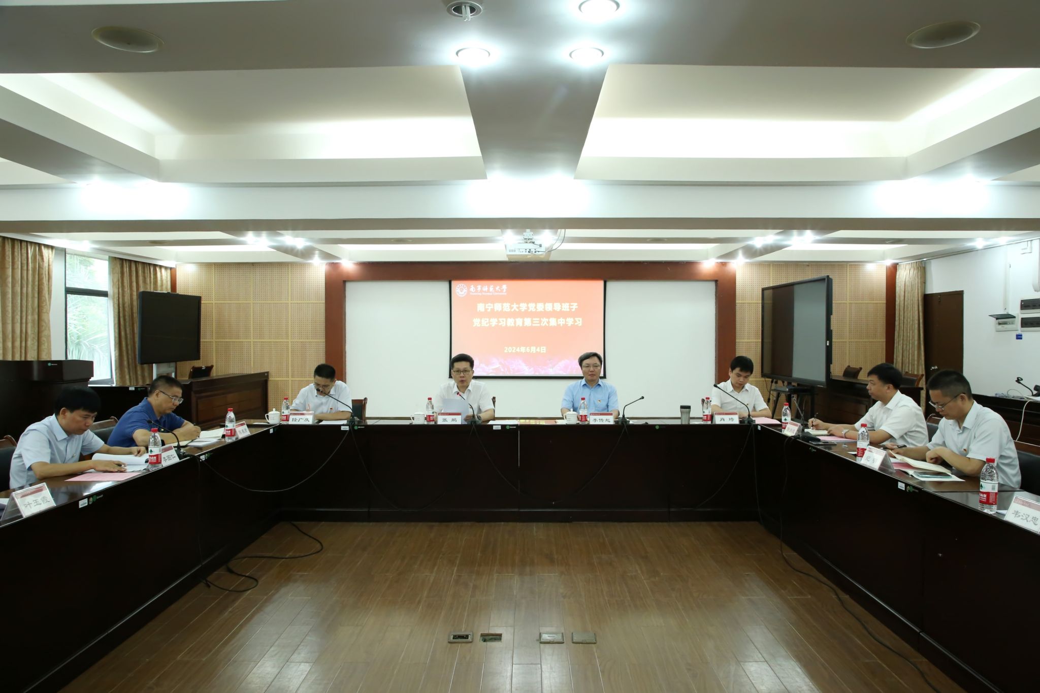 6月4日,学校党委领导班子党纪学习教育第三次集中学习在明秀校区举行。校党委常委参加集中学习,组织部、宣传部、统战部、纪委办(监察室)等部门负责人列席学习。